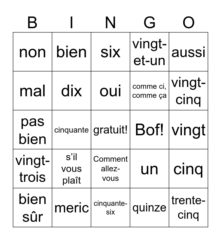 This bingo card has a free space and 24 words: s’il vous plaît, meric, oui, bien sûr, aussi, non, mal, bien, Bof!, Comment allez-vous, comme ci, comme ça, pas bien, un, cinq, dix, quinze, vingt, six, vingt-cinq, cinquante, trente-cinq, vingt-trois, vingt-et-un and cinquante-six.