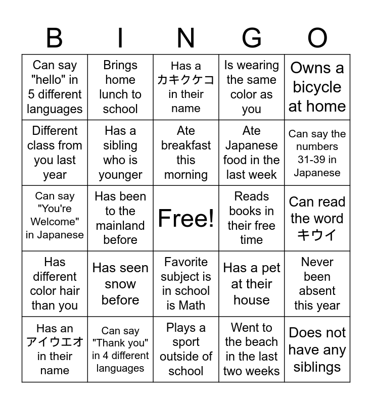 This bingo card has a free space and 29 words: Has an アイウエオ in their name, Has a sibling who is older, Has been to the mainland before, Wears glasses, Can say "hello" in 5 different languages, Has a カキクケコ in their name, Has a sibling who is younger, Has seen snow before, Reads books in their free time, Can say "Thank you" in 4 different languages, Can read the word キウイ, Does not have any siblings, Plays a sport outside of school, Went to the beach in the last two weeks, Can say the numbers 31-39 in Japanese, Likes vanilla more than chocolate, Favorite subject is in school is Math, Has different color hair than you, Owns a bicycle at home, Can say "You're Welcome" in Japanese, Has a pet at their house, Favorite subject in school is English, Ate Japanese food in the last week, Different class from you last year, Is wearing the same color as you, Brings home lunch to school, Never been absent this year, Ate breakfast this morning and Has been to a neighbor island.