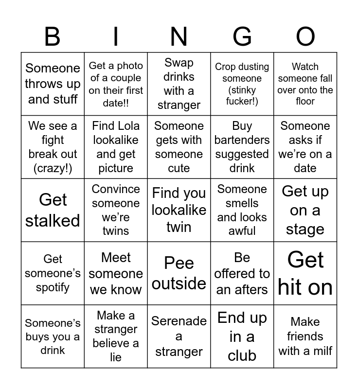 This bingo card has a free space and 24 words: Meet someone we know, Make a stranger believe a lie, Someone gets with someone cute, Someone’s buys you a drink, Watch someone fall over onto the floor, Someone throws up and stuff, We see a fight break out (crazy!), Get a photo of a couple on their first date!!, Someone smells and looks awful, Pee outside, Buy bartenders suggested drink, Get stalked, Be offered to an afters, Get hit on, Find Lola lookalike and get picture, End up in a club, Get up on a stage, Swap drinks with a stranger, Someone asks if we’re on a date, Convince someone we’re twins, Make friends with a milf, Get someone’s spotify, Crop dusting someone (stinky fucker!) and Serenade a stranger.
