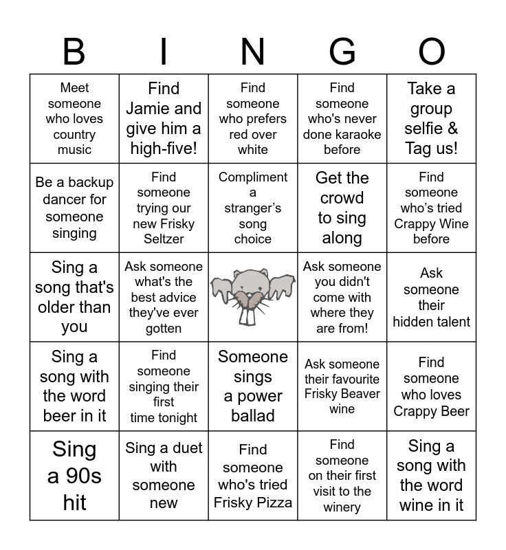 This bingo card has a free space and 24 words: Find someone singing their first time tonight, Sing a duet with someone new, Compliment a stranger’s song choice, Sing a 90s hit, Take a group selfie & Tag us!, Meet someone who loves country music, Be a backup dancer for someone singing, Find Jamie and give him a high-five!, Ask someone you didn't come with where they are from!, Someone sings a power ballad, Get the crowd to sing along, Sing a song that's older than you, Ask someone their favourite Frisky Beaver wine, Find someone who loves Crappy Beer, Find someone trying our new Frisky Seltzer, Find someone on their first visit to the winery, Ask someone their hidden talent, Find someone who prefers red over white, Find someone who’s tried Crappy Wine before, Ask someone what's the best advice they've ever gotten, Sing a song with the word wine in it, Sing a song with the word beer in it, Find someone who's never done karaoke before and Find someone who's tried Frisky Pizza.