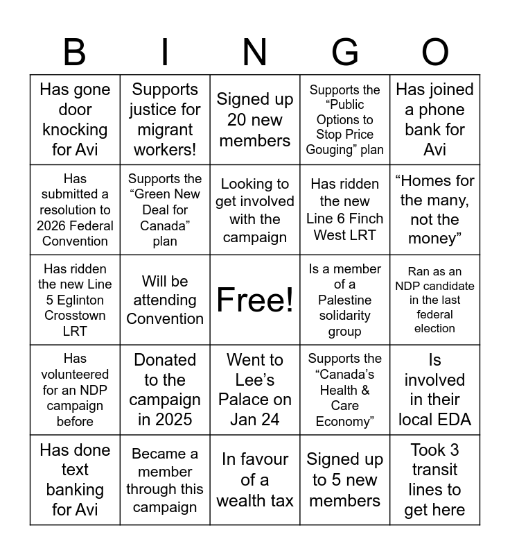 This bingo card has a free space and 24 words: Donated to the campaign in 2025, Became a member through this campaign, Looking to get involved with the campaign, Has done text banking for Avi, Has joined a phone bank for Avi, Has gone door knocking for Avi, Has submitted a resolution to 2026 Federal Convention, Supports justice for migrant workers!, Is a member of a Palestine solidarity group, Went to Lee’s Palace on Jan 24, Has ridden the new Line 6 Finch West LRT, Has ridden the new Line 5 Eglinton Crosstown LRT, Supports the “Canada’s Health & Care Economy”, Is involved in their local EDA, Supports the “Green New Deal for Canada” plan, Signed up to 5 new members, Ran as an NDP candidate in the last federal election, Signed up 20 new members, “Homes for the many, not the money”, Will be attending Convention, Took 3 transit lines to get here, Has volunteered for an NDP campaign before, Supports the “Public Options to Stop Price Gouging” plan and In favour of a wealth tax.