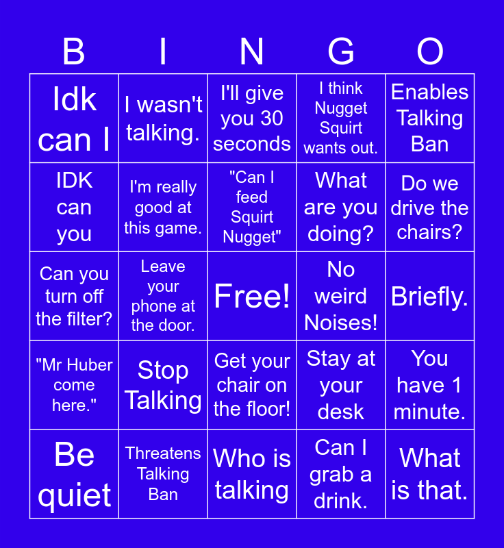 This bingo card has a free space and 24 words: Stop Talking, Threatens Talking Ban, "Can I feed Squirt Nugget", Be quiet, Enables Talking Ban, Idk can I, IDK can you, I wasn't talking., No weird Noises!, Get your chair on the floor!, What are you doing?, Can you turn off the filter?, Stay at your desk, You have 1 minute., I'm really good at this game., Can I grab a drink., Briefly., I'll give you 30 seconds, Do we drive the chairs?, Leave your phone at the door., What is that., "Mr Huber come here.", I think Nugget Squirt wants out. and Who is talking.