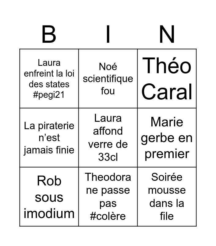 This bingo card has a free space and 8 words: Marie gerbe en premier, Théo Caral, Noé scientifique fou, Rob sous imodium, Laura enfreint la loi des states #pegi21, Soirée mousse dans la file, La piraterie n’est jamais finie and Theodora ne passe pas #colère.