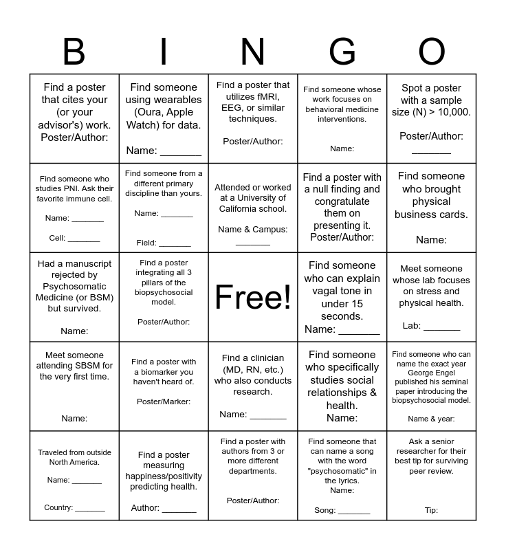 This bingo card has a free space and 24 words: Find a poster with a biomarker you haven't heard of. Poster/Marker:, Find a poster measuring happiness/positivity predicting health. Author: _______, Attended or worked at a University of California school. Name & Campus: _______, Traveled from outside North America. Name: _______ Country: _______, Spot a poster with a sample size (N) > 10,000. Poster/Author: _______, Find a poster that cites your (or your advisor's) work. Poster/Author:, Find someone who studies PNI. Ask their favorite immune cell. Name: _______ Cell: _______, Find someone using wearables (Oura, Apple Watch) for data. Name: _______, Find someone who can explain vagal tone in under 15 seconds. Name: _______, Find a clinician (MD, RN, etc.) who also conducts research. Name: _______, Find a poster with a null finding and congratulate them on presenting it. Poster/Author:, Had a manuscript rejected by Psychosomatic Medicine (or BSM) but survived. Name:, Find someone who specifically studies social relationships & health. Name:, Find someone who can name the exact year George Engel published his seminal paper introducing the biopsychosocial model. Name & year:, Find someone from a different primary discipline than yours. Name: _______ Field: _______, Find someone that can name a song with the word "psychosomatic" in the lyrics. Name: Song: _______, Meet someone whose lab focuses on stress and physical health. Lab: _______, Find a poster that utilizes fMRI, EEG, or similar techniques. Poster/Author:, Find someone who brought physical business cards. Name:, Find a poster integrating all 3 pillars of the biopsychosocial model. Poster/Author:, Ask a senior researcher for their best tip for surviving peer review. Tip:, Meet someone attending SBSM for the very first time. Name:, Find someone whose work focuses on behavioral medicine interventions. Name: and Find a poster with authors from 3 or more different departments. Poster/Author:.