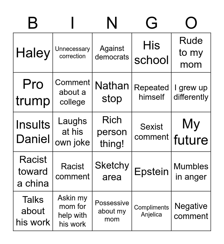 This bingo card has a free space and 24 words: Racist comment, Askin my mom for help with his work, Nathan stop, Talks about his work, Rude to my mom, Haley, Pro trump, Unnecessary correction, Sexist comment, Sketchy area, Repeated himself, Insults Daniel, Epstein, Mumbles in anger, Comment about a college, Compliments Anjelica, My future, Against democrats, I grew up differently, Laughs at his own joke, Negative comment, Racist toward a china, His school and Possessive about my mom.