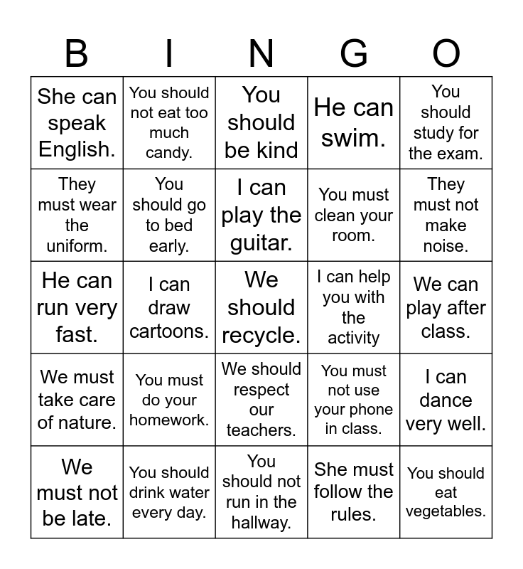 This bingo card has a free space and 24 words: You must do your homework., You should drink water every day., I can play the guitar., We must not be late., You should study for the exam., She can speak English., They must wear the uniform., You should not eat too much candy., I can help you with the activity, We should respect our teachers., You must clean your room., He can run very fast., You must not use your phone in class., I can dance very well., You should go to bed early., She must follow the rules., We can play after class., You should be kind, They must not make noise., I can draw cartoons., You should eat vegetables., We must take care of nature., He can swim. and You should not run in the hallway..
