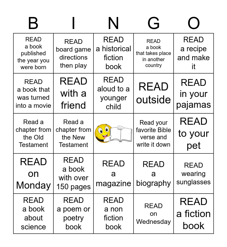 This bingo card has a free space and 24 words: READ a book with over 150 pages, READ a poem or poetry book, READ aloud to a younger child, READ a book about science, READ a recipe and make it, READ a book published the year you were born, READ a book that was turned into a movie, READ board game directions then play, Read your favorite Bible verse and write it down, READ a magazine, READ outside, Read a chapter from the Old Testament, READ a biography, READ wearing sunglasses, READ with a friend, READ on Wednesday, READ to your pet, READ a historical fiction book, READ in your pajamas, Read a chapter from the New Testament, READ a fiction book, READ on Monday, READ a book that takes place in another country and READ a non fiction book.