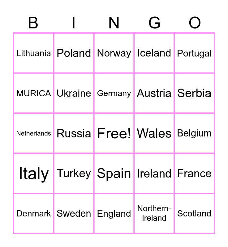 This bingo card has a free space and 24 words: Turkey, Sweden, Germany, Denmark, Portugal, Lithuania, MURICA, Poland, Wales, Spain, Austria, Netherlands, Ireland, France, Ukraine, Northern-Ireland, Belgium, Norway, Serbia, Russia, Scotland, Italy, Iceland and England.