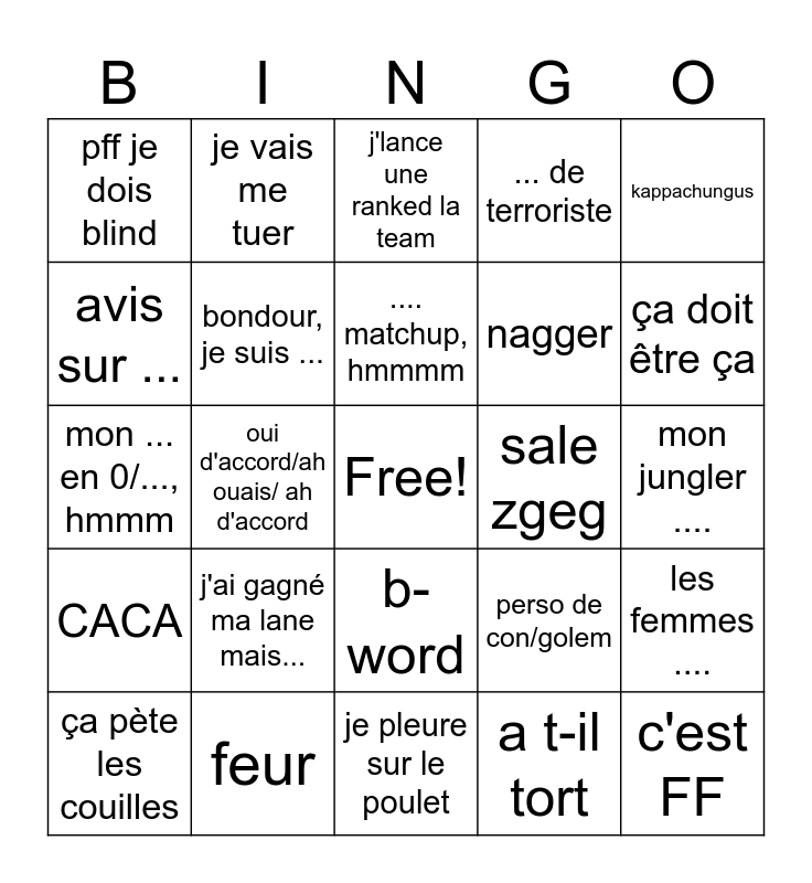 This bingo card has a free space and 24 words: j'ai gagné ma lane mais..., feur, .... matchup, hmmmm, ça pète les couilles, kappachungus, pff je dois blind, avis sur ..., je vais me tuer, sale zgeg, b-word, nagger, mon ... en 0/..., hmmm, perso de con/golem, les femmes ...., bondour, je suis ..., a t-il tort, mon jungler ...., j'lance une ranked la team, ça doit être ça, oui d'accord/ah ouais/ ah d'accord, c'est FF, CACA, ... de terroriste and je pleure sur le poulet.