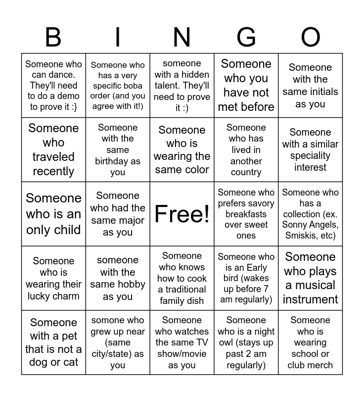 This bingo card has a free space and 24 words: someone with the same hobby as you, somone who grew up near (same city/state) as you, Someone who is wearing the same color, Someone with a pet that is not a dog or cat, Someone with the same initials as you, Someone who can dance. They'll need to do a demo to prove it :}, Someone who traveled recently, Someone who has a very specific boba order (and you agree with it!), Someone who prefers savory breakfasts over sweet ones, Someone who knows how to cook a traditional family dish, Someone who has lived in another country, Someone who is an only child, Someone who is an Early bird (wakes up before 7 am regularly), Someone who plays a musical instrument, Someone with the same birthday as you, Someone who is a night owl (stays up past 2 am regularly), Someone who has a collection (ex. Sonny Angels, Smiskis, etc), someone with a hidden talent. They'll need to prove it :), Someone with a similar speciality interest, Someone who had the same major as you, Someone who is wearing school or club merch, Someone who is wearing their lucky charm, Someone who you have not met before and Someone who watches the same TV show/movie as you.