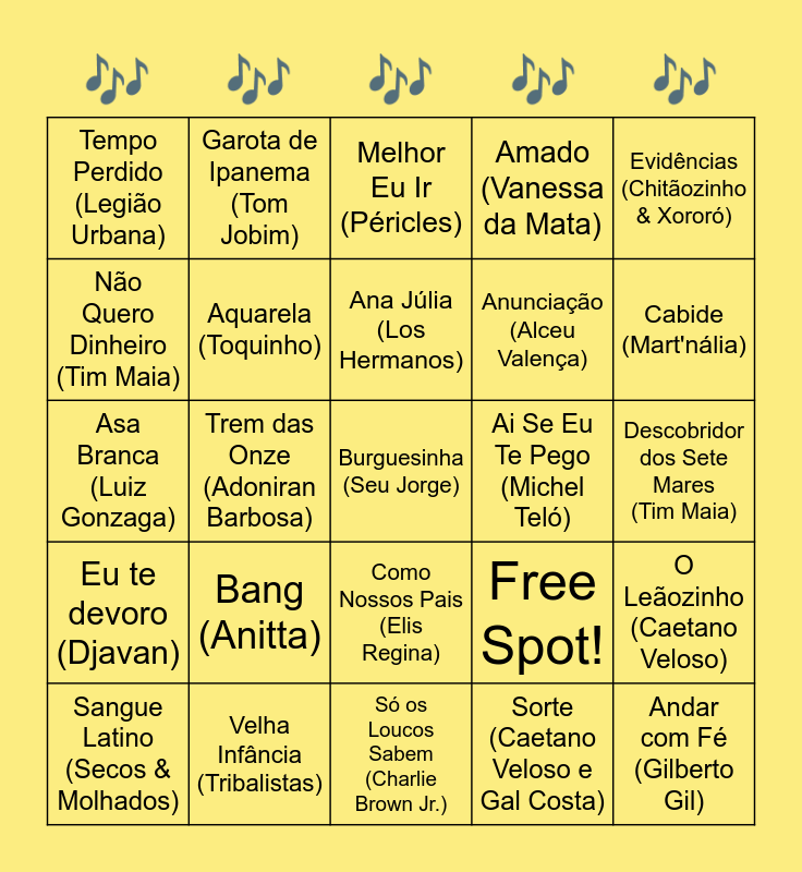 This bingo card has 25 words: Bang (Anitta), Só os Loucos Sabem (Charlie Brown Jr.), Ana Júlia (Los Hermanos), Sangue Latino (Secos & Molhados), Evidências (Chitãozinho & Xororó), Tempo Perdido (Legião Urbana), Não Quero Dinheiro (Tim Maia), Garota de Ipanema (Tom Jobim), Ai Se Eu Te Pego (Michel Teló), Como Nossos Pais (Elis Regina), Anunciação (Alceu Valença), Asa Branca (Luiz Gonzaga), Free Spot!, O Leãozinho (Caetano Veloso), Aquarela (Toquinho), Andar com Fé (Gilberto Gil), Descobridor dos Sete Mares (Tim Maia), Melhor Eu Ir (Péricles), Cabide (Mart'nália), Trem das Onze (Adoniran Barbosa), Burguesinha (Seu Jorge), Velha Infância (Tribalistas), Eu te devoro (Djavan), Amado (Vanessa da Mata) and Sorte (Caetano Veloso e Gal Costa).
