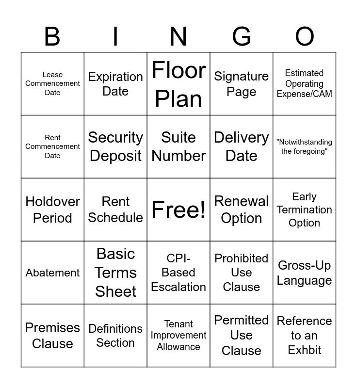 This bingo card has a free space and 24 words: Basic Terms Sheet, Definitions Section, Suite Number, Premises Clause, Estimated Operating Expense/CAM, Lease Commencement Date, Rent Commencement Date, Expiration Date, Renewal Option, CPI-Based Escalation, Delivery Date, Holdover Period, Prohibited Use Clause, Gross-Up Language, Security Deposit, Permitted Use Clause, Early Termination Option, Floor Plan, "Notwithstanding the foregoing", Rent Schedule, Reference to an Exhbit, Abatement, Signature Page and Tenant Improvement Allowance.