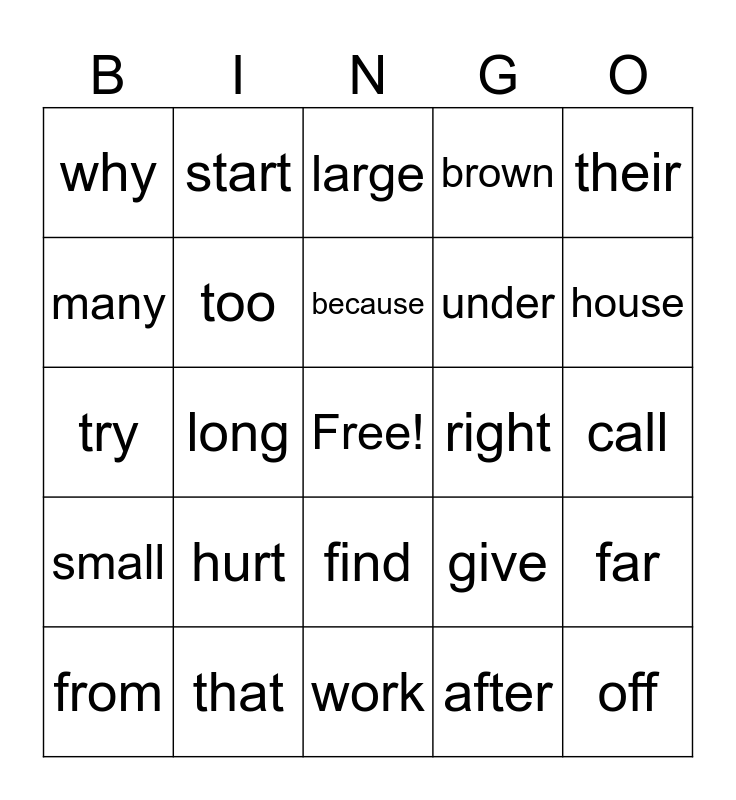 This bingo card has a free space and 24 words: hurt, that, because, from, their, why, many, start, right, find, under, try, give, far, too, after, call, large, house, long, off, small, brown and work.