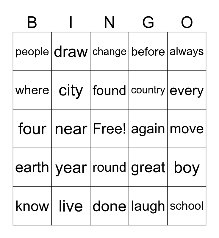 This bingo card has a free space and 24 words: year, live, found, know, always, people, where, draw, again, round, country, four, great, boy, city, laugh, move, change, every, near, school, earth, before and done.