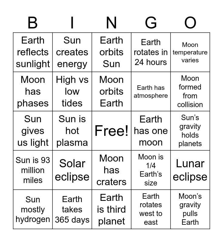 This bingo card has a free space and 24 words: Solar eclipse, Earth takes 365 days, Moon orbits Earth, Sun mostly hydrogen, Moon temperature varies, Earth reflects sunlight, Moon has phases, Sun creates energy, Earth has one moon, Moon has craters, Earth has atmosphere, Sun gives us light, Moon is 1/4 Earth’s size, Lunar eclipse, High vs low tides, Earth rotates west to east, Sun’s gravity holds planets, Earth orbits Sun, Moon formed from collision, Sun is hot plasma, Moon’s gravity pulls Earth, Sun is 93 million miles, Earth rotates in 24 hours and Earth is third planet.