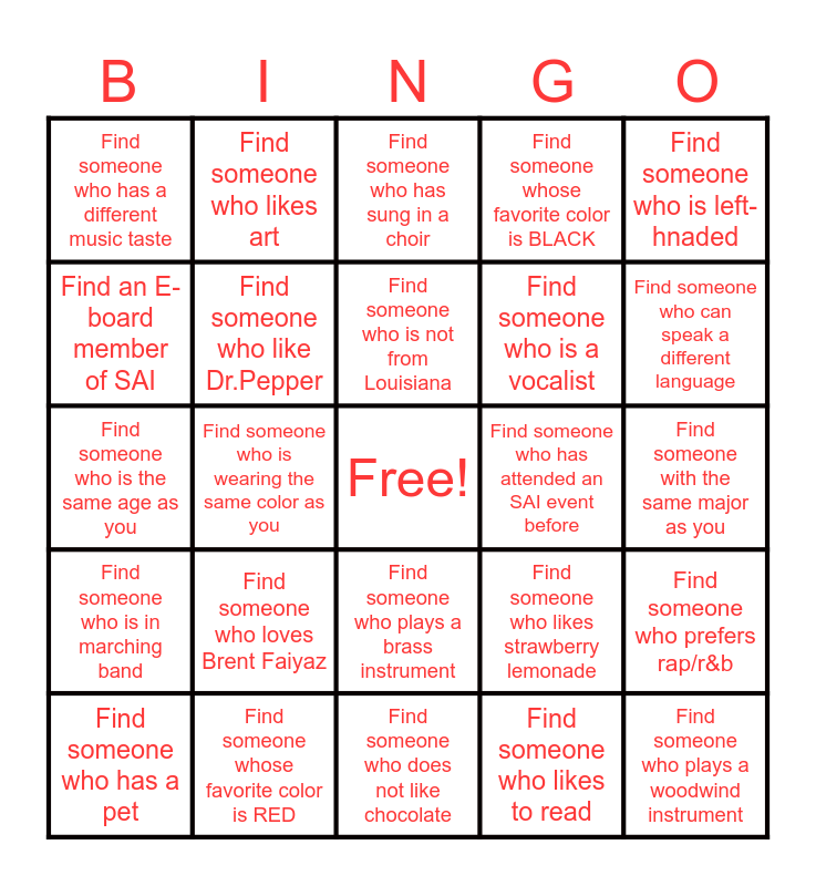 This bingo card has a free space and 24 words: Find someone who loves Brent Faiyaz, Find someone whose favorite color is RED, Find someone who is not from Louisiana, Find someone who has a pet, Find someone who is left-hnaded, Find someone who has a different music taste, Find an E-board member of SAI, Find someone who likes art, Find someone who has attended an SAI event before, Find someone who plays a brass instrument, Find someone who is a vocalist, Find someone who is the same age as you, Find someone who likes strawberry lemonade, Find someone who prefers rap/r&b, Find someone who like Dr.Pepper, Find someone who likes to read, Find someone with the same major as you, Find someone who has sung in a choir, Find someone who can speak a different language, Find someone who is wearing the same color as you, Find someone who plays a woodwind instrument, Find someone who is in marching band, Find someone whose favorite color is BLACK and Find someone who does not like chocolate.