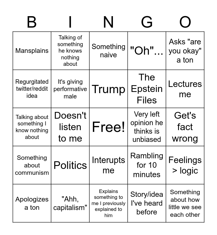 This bingo card has a free space and 24 words: Politics, "Ahh, capitalism", Trump, Apologizes a ton, Asks "are you okay" a ton, Mansplains, Regurgitated twitter/reddit idea, Talking of something he knows nothing about, Very left opinion he thinks is unbiased, Interupts me, The Epstein Files, Talking about something I know nothing about, Rambling for 10 minutes, Feelings > logic, It's giving performative male, Story/idea I've heard before, Get's fact wrong, Something naive, Lectures me, Doesn't listen to me, Something about how little we see each other, Something about communism, "Oh"... and Explains something to me I previously explained to him.