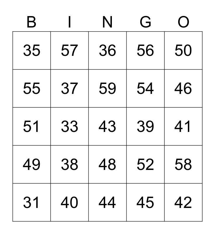 This bingo card has a free space and 29 words: 31, 32, 33, 34, 35, 36, 37, 38, 39, 40, 41, 42, 44, 45, 46, 47, 48, 49, 50, 51, 52, 53, 54, 55, 56, 57, 58, 59 and 60.