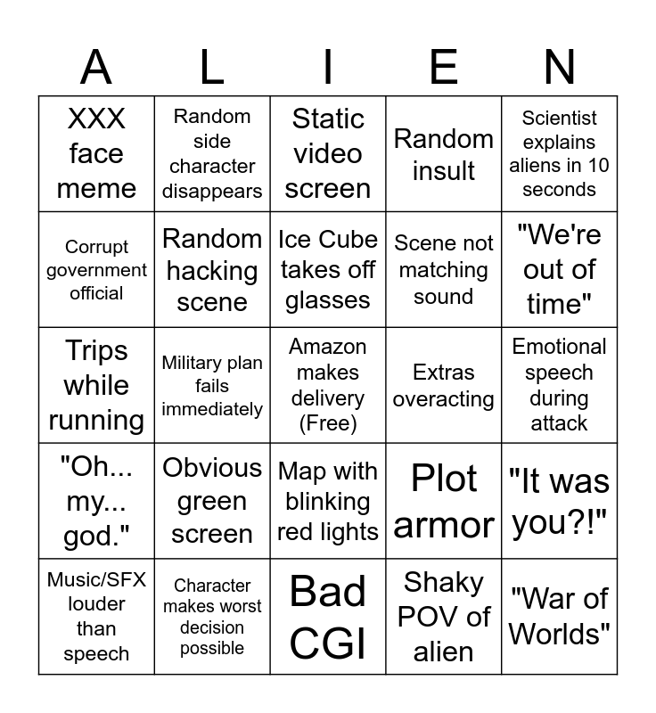This bingo card has a free space and 37 words: Real news footage reused, Touchdown, Government official says nothing useful, Random hacking scene, "It was you?!", Obvious green screen, Ice Cube takes off glasses, "That's classified", Scientist explains aliens in 10 seconds, Ice Cube restates something obvious, Military plan fails immediately, Random insult, "War of Worlds", Emotional speech during attack, Corrupt government official, "Oh... my... god.", Faith is clear favorite, Static video screen, Map with blinking red lights, Extras overacting, XXX face meme, "We're out of time", Music/SFX louder than speech, Bad CGI, Unnecessary sacrifice, Shaky POV of alien, Random side character disappears, Phone running out of battery, Plot hole, "I can't believe this", Confusing or abrupt cut, Character makes worst decision possible, Trips while running, Character survives something they shouldn't, Plot armor, Scene not matching sound and Ice Cube moves >5ft.
