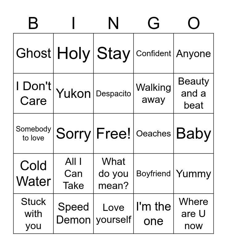 This bingo card has a free space and 30 words: Speed Demon, Daisies, Sorry, Intentions, Ghost, Stay, Yukon, What do you mean?, Oeaches, Love yourself, Baby, Where are U now, I'm the one, Let me love you, Beauty and a beat, Hold On, Boyfriend, Cold Water, All I Can Take, Anyone, Somebody to love, As long as you love me, Holy, Walking away, I Don't Care, Confident, Yummy, Stuck with you, Despacito and No Brainer.