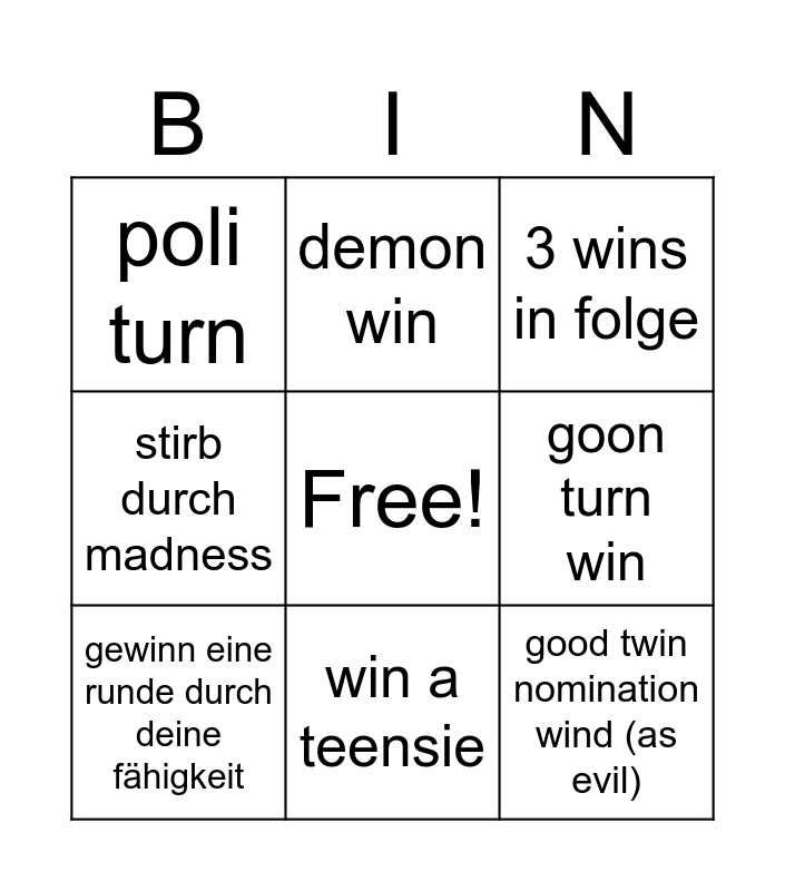 This bingo card has a free space and 9 words: gewinn eine runde durch deine fähigkeit, 3 wins in folge, demon win, stirb durch madness, poli turn, goon turn win, good twin nomination wind (as evil), revie someone as a professor and win a teensie.