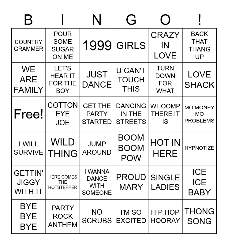 This bingo card has 36 words: PROUD MARY, I WANNA DANCE WITH SOMEONE, I'M SO EXCITED, WE ARE FAMILY, I WILL SURVIVE, DANCING IN THE STREETS, LET'S HEAR IT FOR THE BOY, NO SCRUBS, CRAZY IN LOVE, SINGLE LADIES, LOVE SHACK, GIRLS, ICE ICE BABY, COTTON EYE JOE, U CAN'T TOUCH THIS, COUNTRY GRAMMER, GETTIN' JIGGY WITH IT, WHOOMP THERE IT IS, Free!, 1999, GET THE PARTY STARTED, WILD THING, BOOM BOOM POW, JUMP AROUND, HOT IN HERE, POUR SOME SUGAR ON ME, TURN DOWN FOR WHAT, PARTY ROCK ANTHEM, JUST DANCE, BACK THAT THANG UP, THONG SONG, BYE BYE BYE, HYPNOTIZE, MO MONEY MO PROBLEMS, HERE COMES THE HOTSTEPPER and HIP HOP HOORAY.