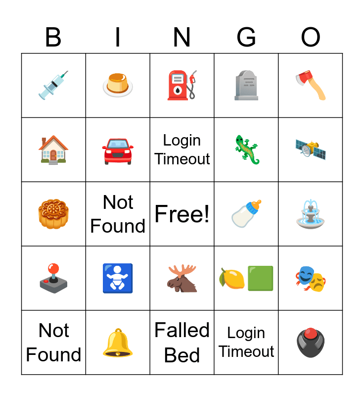 This bingo card has a free space and 24 words: ðž, ð, Login Timeout, Not Found, ðŠ, ð, ð , ðŪ, ðž, ðŦ, ðĶ, ðĨŪ, ðâðĐ, ð, ð, Login Timeout, âēïļ, â―ïļ, ð°ïļ, Not Found, ðēïļ, ðđïļ, ðŠĶ and Falled Bed.