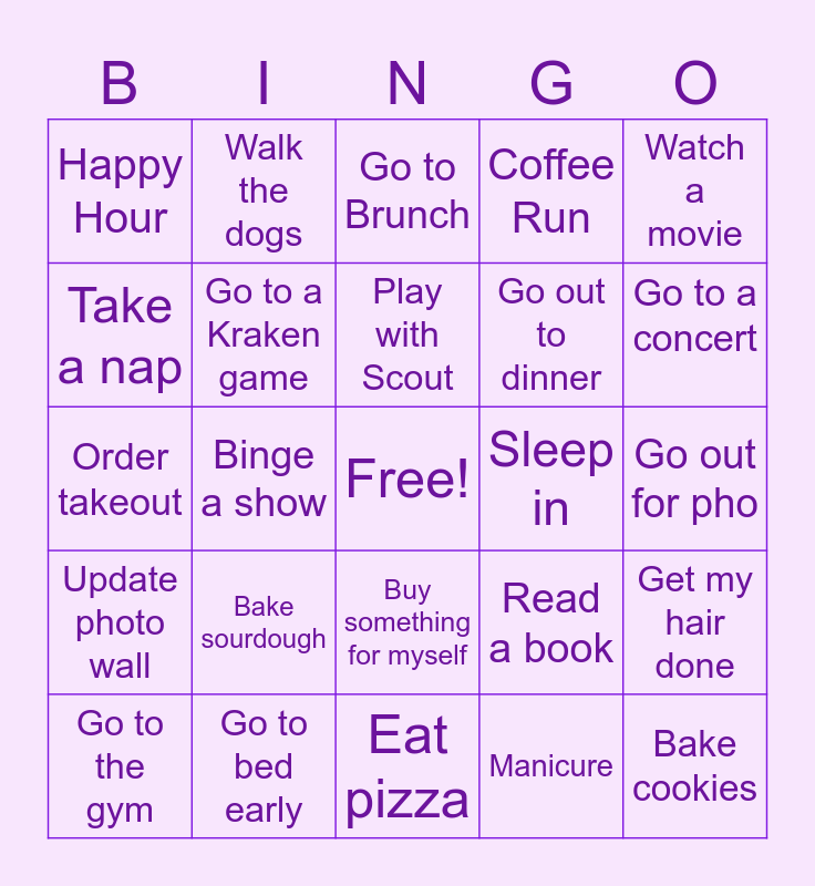 This bingo card has a free space and 24 words: Bake sourdough, Go to bed early, Play with Scout, Go to the gym, Watch a movie, Happy Hour, Take a nap, Walk the dogs, Sleep in, Buy something for myself, Go out to dinner, Order takeout, Read a book, Get my hair done, Go to a Kraken game, Manicure, Go out for pho, Go to Brunch, Go to a concert, Binge a show, Bake cookies, Update photo wall, Coffee Run and Eat pizza.
