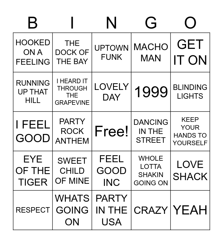 This bingo card has a free space and 24 words: SWEET CHILD OF MINE, WHATS GOING ON, LOVELY DAY, RESPECT, GET IT ON, HOOKED ON A FEELING, RUNNING UP THAT HILL, THE DOCK OF THE BAY, DANCING IN THE STREET, FEEL GOOD INC, 1999, I FEEL GOOD, WHOLE LOTTA SHAKIN GOING ON, LOVE SHACK, I HEARD IT THROUGH THE GRAPEVINE, CRAZY, KEEP YOUR HANDS TO YOURSELF, UPTOWN FUNK, BLINDING LIGHTS, PARTY ROCK ANTHEM, YEAH, EYE OF THE TIGER, MACHO MAN and PARTY IN THE USA.
