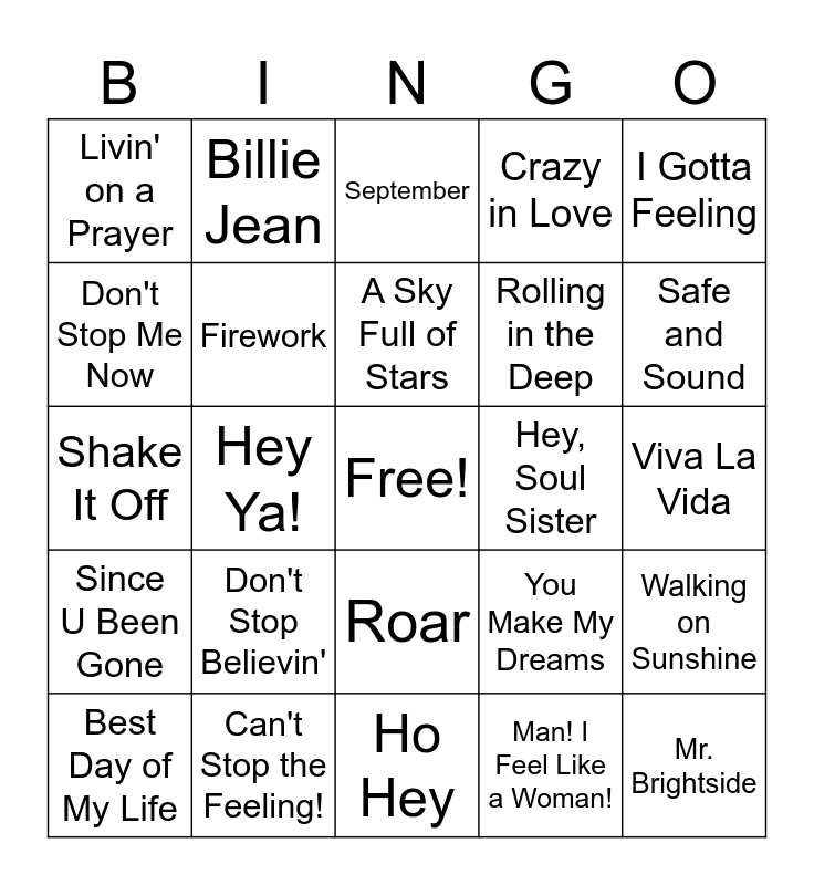 This bingo card has a free space and 40 words: Uptown Funk, Shake It Off, Happy, Firework, Can't Stop the Feeling!, Roar, A Sky Full of Stars, Counting Stars, I Gotta Feeling, Since U Been Gone, Hey Ya!, Crazy in Love, Mr. Brightside, Viva La Vida, Hey, Soul Sister, Don't Stop Believin', Sweet Caroline, Livin' on a Prayer, I Wanna Dance with Somebody, September, Walking on Sunshine, Man! I Feel Like a Woman!, Rolling in the Deep, Don't Stop Me Now, Uptown Girl, All Star, Call Me Maybe, Feel It Still, Sugar, Can't Take My Eyes Off You, Wake Me Up, Best Day of My Life, I'm a Believer, You Make My Dreams, Safe and Sound, Ho Hey, Rather Be, On Top of the World, Billie Jean and Signed, Sealed, Delivered.