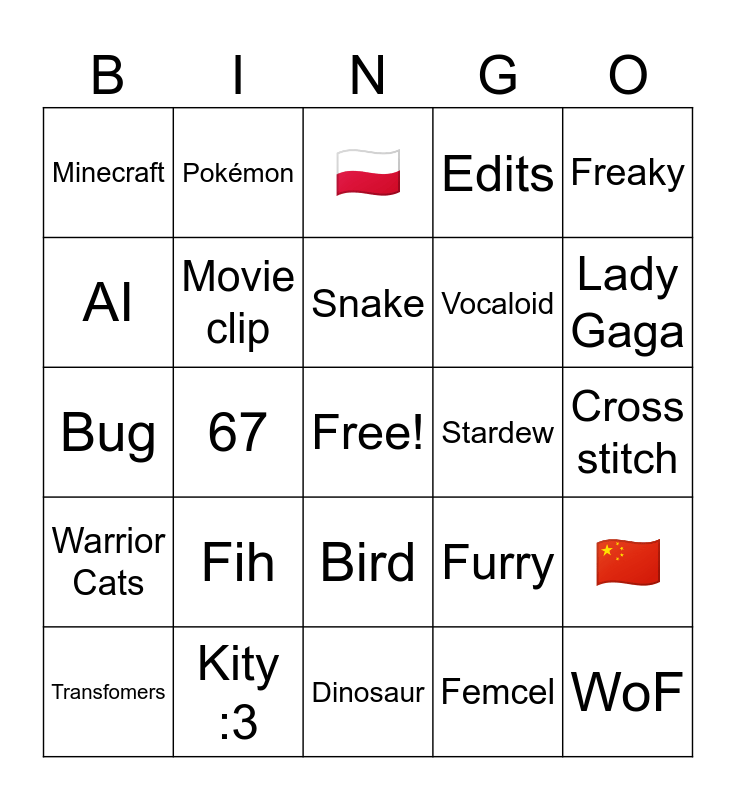This bingo card has a free space and 24 words: Fih, Kity :3, Snake, Transfomers, Freaky, Minecraft, AI, Pokémon, Stardew, Bird, Vocaloid, Bug, Furry, 🇨🇳, Movie clip, Femcel, Cross stitch, 🇵🇱, Lady Gaga, 67, WoF, Warrior Cats, Edits and Dinosaur.