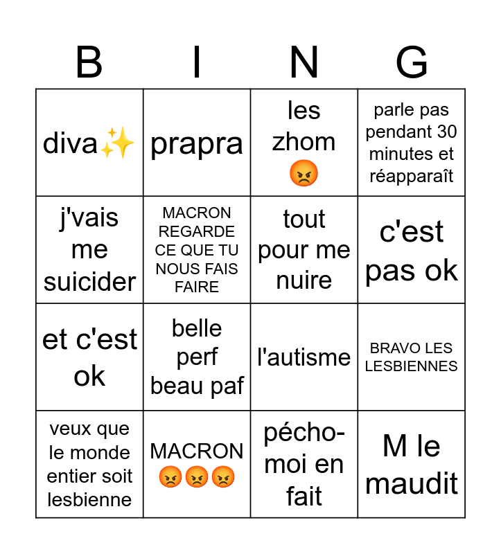 This bingo card has 16 words: MACRON 😡😡😡, BRAVO LES LESBIENNES, les zhom 😡, diva✨, et c'est ok, prapra, l'autisme, pécho-moi en fait, j'vais me suicider, MACRON REGARDE CE QUE TU NOUS FAIS FAIRE, veux que le monde entier soit lesbienne, parle pas pendant 30 minutes et réapparaît, belle perf beau paf, c'est pas ok, tout pour me nuire and M le maudit.