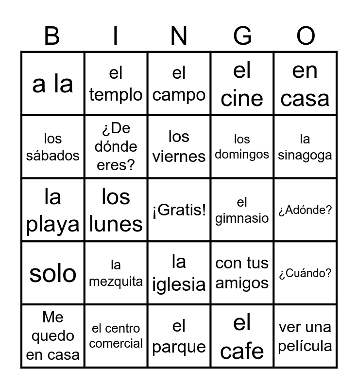 This bingo card has a free space and 44 words: ir de compras, ver una película, la lección de piano, Me quedo en casa, la biblioteca, el cafe, el campo, la casa, en casa, el centro comercial, el cine, el gimnasio, la iglesia, la mezquita, las montañas, el parque, la piscina, la playa, el restaurante, la sinagoga, el templo, el trabajo, a, a la, al, ¿Adónde?, ¿Con quién?, con mis amigos, con tus amigos, solo, sola, ¿Cuándo?, después de, los fines de semana, los lunes, los martes, los miércoles, los jueves, los viernes, los sábados, los domingos, tiempo libre, ¿De dónde eres? and de.