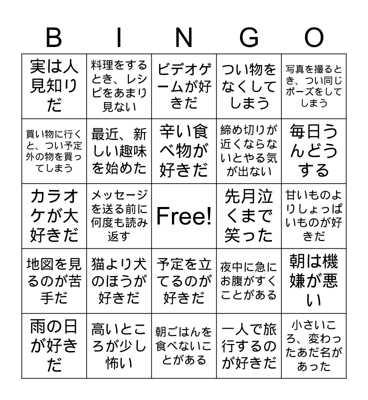 This bingo card has a free space and 34 words: コーヒーがないと生きられない, 一人で旅行するのが好きだ, 朝型タイプだ, お酒に強い, 地図を見るのが苦手だ, 最近、新しい趣味を始めた, 写真を撮るとき、つい同じポーズをしてしまう, 雨の日が好きだ, 料理をするとき、レシピをあまり見ない, 楽器がひける, 辛い食べ物が好きだ, ビデオゲームが好きだ, 夜型タイプだ, ペットがかっている, 先月泣くまで笑った, 毎日うんどうする, 高いところが少し怖い, カラオケが大好きだ, 猫より犬のほうが好きだ, 夜中に急にお腹がすくことがある, 予定を立てるのが好きだ, 休みの日は家でゆっくりすることが多い, 実は人見知りだ, 甘いものよりしょっぱいものが好きだ, 朝ごはんを食べないことがある, 小さいころ、変わったあだ名があった, つい物をなくしてしまう, 人ごみがちょっと苦手だ, 締め切りが近くならないとやる気が出ない, 買い物に行くと、つい予定外の物を買ってしまう, 負けず嫌いだ, メッセージを送る前に何度も読み返す, 朝は機嫌が悪い and よく待ち合わせに遅れる.