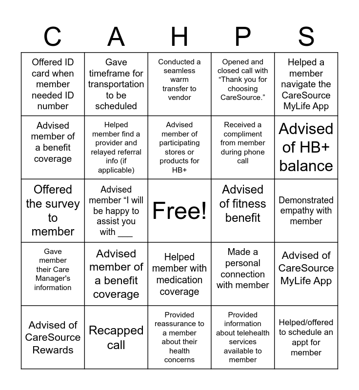 This bingo card has a free space and 24 words: Advised member of a benefit coverage, Recapped call, Advised member of participating stores or products for HB+, Advised of CareSource Rewards, Helped a member navigate the CareSource MyLife App, Offered ID card when member needed ID number, Advised member of a benefit coverage, Gave timeframe for transportation to be scheduled, Advised of fitness benefit, Helped member with medication coverage, Received a compliment from member during phone call, Offered the survey to member, Made a personal connection with member, Advised of CareSource MyLife App, Helped member find a provider and relayed referral info (if applicable), Provided information about telehealth services available to member, Demonstrated empathy with member, Conducted a seamless warm transfer to vendor, Advised of HB+ balance, Advised member “I will be happy to assist you with ___, Helped/offered to schedule an appt for member, Gave member their Care Manager's information, Opened and closed call with “Thank you for choosing CareSource.” and Provided reassurance to a member about their health concerns.