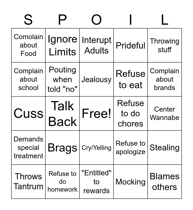 This bingo card has a free space and 29 words: Throws Tantrum, Refuse to share, Talk Back, Not Grateful, Comolain about Food, Interupt Adults, Pouting when told "no", Brags, Refuse to do chores, Refuse to do homework, Center Wannabe, Blames others, "Entitled" to rewards, Mocking, Complain about brands, Ignores, Cry/Yelling, Demands special treatment, Throwing stuff, Cuss, Refuse to apologize, "Borrowing", Refuse to eat, Complain about school, Prideful, Ignore Limits, Stealing, Jealousy and Run off.