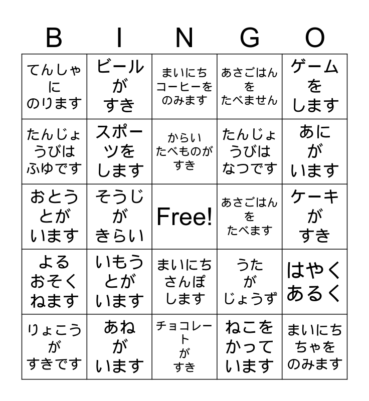 This bingo card has a free space and 34 words: カラオケが すき, ねこを かって います, いぬを かって います, あさ はやく おきます, よる おそく ねます, スポーツを します, ゲーム を します, りょこうが すきです, ビール が すき, あまいもの が きらい, からい たべものが すき, まいにち コーヒーをのみます, ダンス が すき, りょうりが すき, あさごはん を たべます, あに が います, あね が います, おとうとが います, いもうとが います, うた が じょうず, まいにちさんぽ します, くるまをうんてんします, てんしゃに のります, ケーキ が すき, チョコレート が すき, まいにちちゃを のみます, あさごはんを たべません, よく えいがかんにいきます, たんじょうびは なつです, たんじょうびは ふゆです, よくドラマ を みます, そうじ が きらい, はやくあるく and でんしゃで ねます.