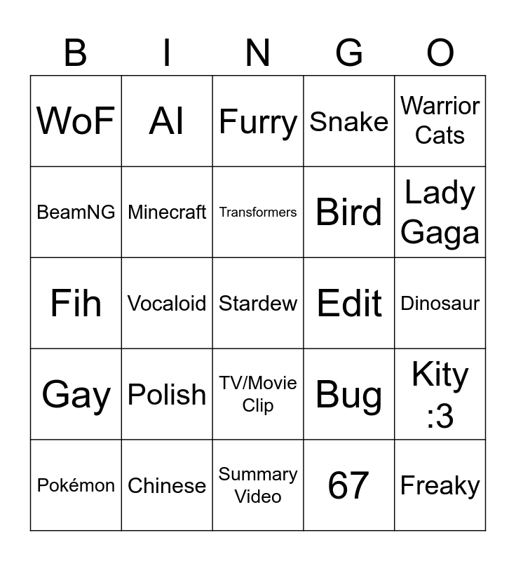 This bingo card has a free space and 24 words: Polish, Chinese, Transformers, Pokémon, Warrior Cats, WoF, BeamNG, AI, Edit, TV/Movie Clip, Bird, Fih, Bug, Kity :3, Minecraft, 67, Dinosaur, Furry, Lady Gaga, Vocaloid, Freaky, Gay, Snake and Summary Video.