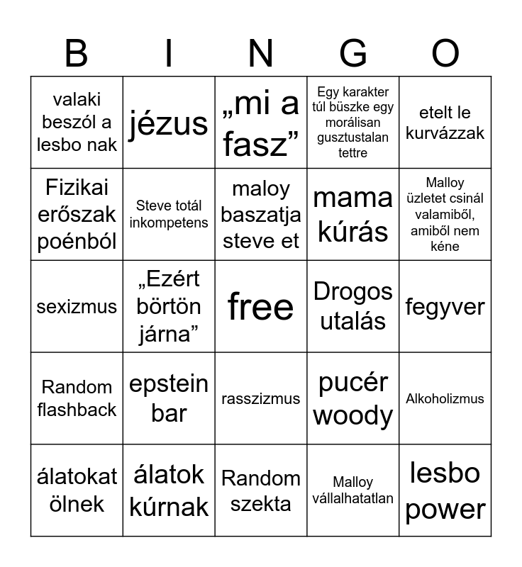 This bingo card has a free space and 24 words: epstein bar, álatok kúrnak, maloy baszatja steve et, álatokat ölnek, etelt le kurvázzak, valaki beszól a lesbo nak, Fizikai erőszak poénból, jézus, Drogos utalás, rasszizmus, mama kúrás, sexizmus, pucér woody, Alkoholizmus, Steve totál inkompetens, Malloy vállalhatatlan, fegyver, „mi a fasz”, Malloy üzletet csinál valamiből, amiből nem kéne, „Ezért börtön járna”, lesbo power, Random flashback, Egy karakter túl büszke egy morálisan gusztustalan tettre and Random szekta.