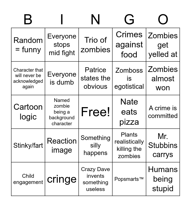 This bingo card has a free space and 24 words: Reaction image, cringe, Patrice states the obvious, Child engagement, Zombies get yelled at, Random = funny, Character that will never be acknowledged again, Everyone stops mid fight, Nate eats pizza, Something silly happens, Zomboss is egotistical, Cartoon logic, Plants realistically killing the zombies, Mr. Stubbins carrys, Everyone is dumb, Popsmarts™, A crime is committed, Trio of zombies, Zombies almost won, Named zombie being a background character, Humans being stupid, Stinky/fart, Crimes against food and Crazy Dave invents something useless.