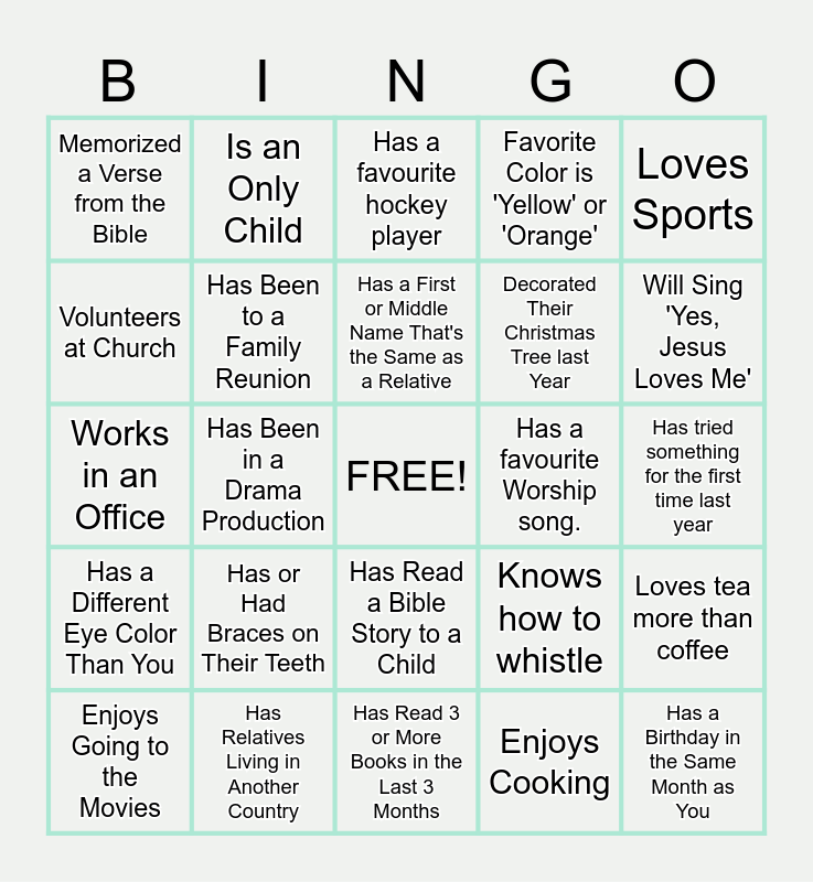 This bingo card has a free space and 24 words: Has or Had Braces on Their Teeth, Has Relatives Living in Another Country, Has a First or Middle Name That's the Same as a Relative, Enjoys Going to the Movies, Loves Sports, Memorized a Verse from the Bible, Volunteers at Church, Is an Only Child, Has a favourite Worship song., Has Read a Bible Story to a Child, Decorated Their Christmas Tree last Year, Works in an Office, Knows how to whistle, Loves tea more than coffee, Has Been to a Family Reunion, Enjoys Cooking, Has tried something for the first time last year, Has a favourite hockey player, Will Sing 'Yes, Jesus Loves Me', Has Been in a Drama Production, Has a Birthday in the Same Month as You, Has a Different Eye Color Than You, Favorite Color is 'Yellow' or 'Orange' and Has Read 3 or More Books in the Last 3 Months.