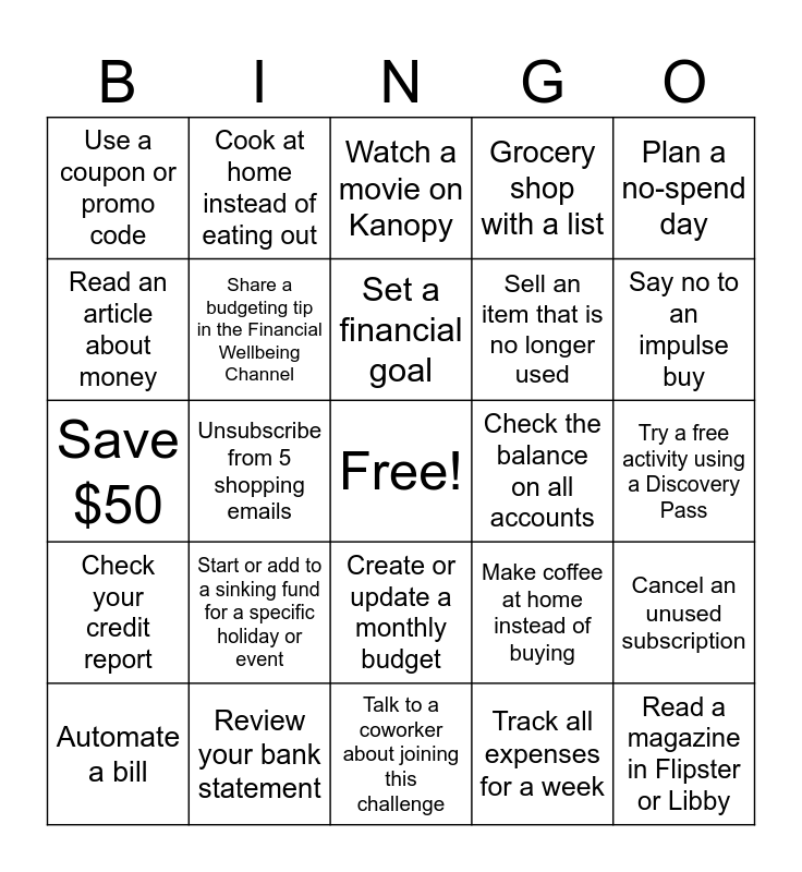 This bingo card has a free space and 26 words: Create or update a monthly budget, Track all expenses for a week, Set a financial goal, Review your bank statement, Plan a no-spend day, Use a coupon or promo code, Read an article about money, Cook at home instead of eating out, Try a free activity using a Discovery Pass, Make coffee at home instead of buying, Sell an item that is no longer used, Save $50, Cancel an unused subscription, Automate a bill, Unsubscribe from 5 shopping emails, Check out a book or audiobook, Grocery shop with a list, Check your credit report, Watch a movie on Kanopy, Read a magazine in Flipster or Libby, Say no to an impulse buy, Talk to a coworker about joining this challenge, Check the balance on all accounts, Start or add to a sinking fund for a specific holiday or event, Share a budgeting tip in the Financial Wellbeing Channel and Compare prices before buying something.