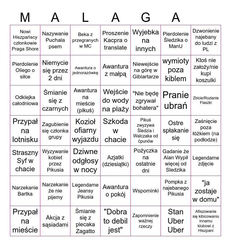 This bingo card has 49 words: Pompka z najebanego Pikusia, wymioty poza kiblem, Zapomnienie ważnej rzeczy, Zagubienie się członka grupy, Awantura na mieście (pikuś), Zaśnięcie poza łóżkiem (na podłodze), Nazywanie Puchala psem, Śmianie się z plecaka Zagatto, Pierdolenie Śledzika o ManU, Azjatki (dziesiątki), Dzwonienie najebany do ludzi z PL, Proszenie Kacpra o translate, Pranie ubrań, "Nie będę zgrywał bohatera", Narzekanie że nie pijemy, Ostre spłakanie się, Pierdolenie Oliego o siłce, Ktoś nie założy/nie kupi koszulki, "ja zostaje w domu", Wyjebka na innych, Niewejście na górę w Giblartarze, Kozioł ofiarny wyjazdu, Nowi Hiszpańscy członkowie Praga Shore, Niemycie się przez 2 dni, Przypał na mieście, Awantura o jednorazówkę, Zbicie/Rozlanie Flaszki, Akcja z sąsiadami, Wejście do wody na plaży, Śmianie się z czarnych, Afiszowanie się kibicowaniu innemu klubowi z Hiszpani, Pikuś zwyzywa Śledzia i Walczaka od ćpunów, Narzekanie Bartka, Legendarne Jeansy Pikusia, Przypał na lotnisku, Pożyczka na ostatnie dni, Gadanie że Alan Wypił więcej od Sledzika, Legendarne zdjęcie, Odklejka całodniowa, Dziwne odgłosy w nocy, Awantura o pokój, Straszny Syf w chacie, Szkoda w chacie, "Dobra to debil jest", Awantura z małpą, Beka z przegranych w MC, Wspominki, Wyzywanie kobiet przez Pikusia and Stan Uber Uber.