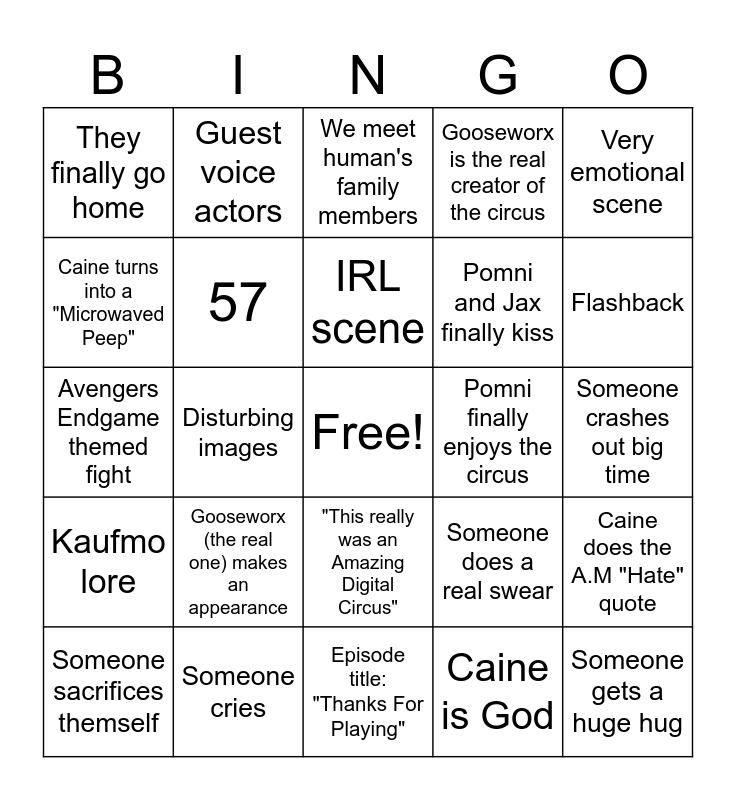 This bingo card has a free space and 24 words: Gooseworx (the real one) makes an appearance, Someone cries, IRL scene, Someone sacrifices themself, Very emotional scene, They finally go home, Caine turns into a "Microwaved Peep", Guest voice actors, Pomni finally enjoys the circus, "This really was an Amazing Digital Circus", Pomni and Jax finally kiss, Avengers Endgame themed fight, Someone does a real swear, Caine does the A.M "Hate" quote, 57, Caine is God, Someone crashes out big time, We meet human's family members, Flashback, Disturbing images, Someone gets a huge hug, Kaufmo lore, Gooseworx is the real creator of the circus and Episode title: "Thanks For Playing".