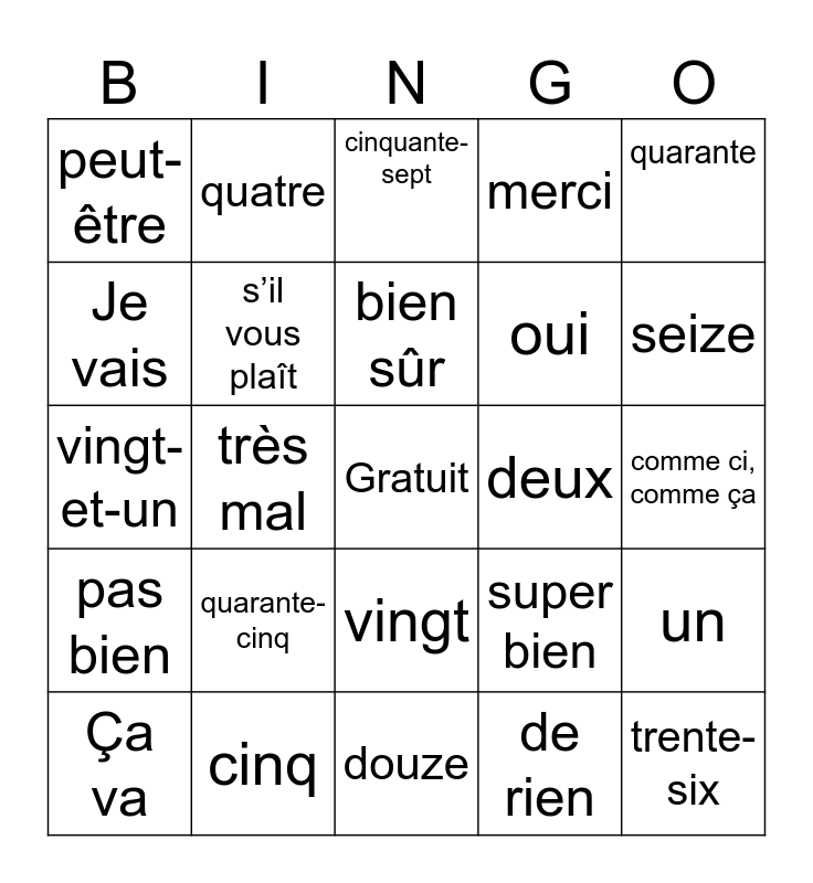 This bingo card has a free space and 24 words: quarante-cinq, cinq, bien sûr, Ça va, quarante, peut-être, Je vais, quatre, deux, vingt, oui, vingt-et-un, super bien, un, s’il vous plaît, de rien, comme ci, comme ça, cinquante-sept, seize, très mal, trente-six, pas bien, merci and douze.