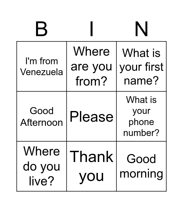 This bingo card has 22 words: How are you?, What is your name?, Where are you from?, Nice to meet you., What is your phone number?, Where do you live?, I'm from Venezuela, What is your first name?, What is your last name?, hello, Good morning, Good Afternoon, Good night, See you later, See you tomorrow, What's up?, What's new?, Nice to meet you, Goodbye, Please, Thank you and My name is.