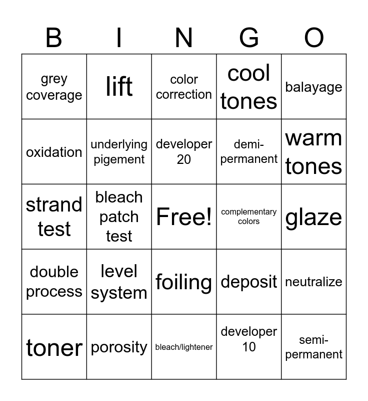 This bingo card has a free space and 24 words: level system, porosity, developer 20, toner, balayage, grey coverage, oxidation, lift, complementary colors, foiling, demi- permanent, strand test, deposit, neutralize, underlying pigement, developer 10, glaze, color correction, warm tones, bleach patch test, semi-permanent, double process, cool tones and bleach/lightener.