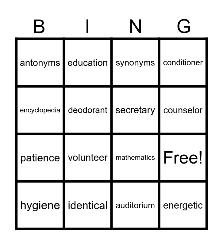 This bingo card has 16 words: identical, Free!, synonyms, antonyms, patience, education, mathematics, auditorium, encyclopedia, deodorant, hygiene, conditioner, volunteer, counselor, secretary and energetic.