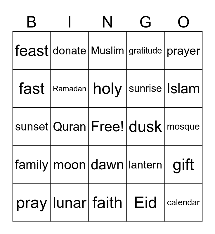 This bingo card has a free space and 24 words: moon, lunar, holy, pray, prayer, feast, fast, donate, dusk, dawn, sunrise, sunset, lantern, gift, Ramadan, Eid, mosque, Muslim, Islam, Quran, calendar, family, gratitude and faith.