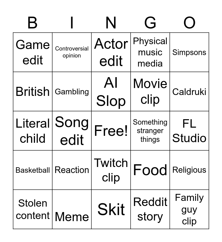 This bingo card has a free space and 24 words: Reaction, Meme, AI Slop, Stolen content, Simpsons, Game edit, British, Controversial opinion, Something stranger things, Twitch clip, Movie clip, Literal child, Food, Religious, Gambling, Reddit story, FL Studio, Actor edit, Caldruki, Song edit, Family guy clip, Basketball, Physical music media and Skit.